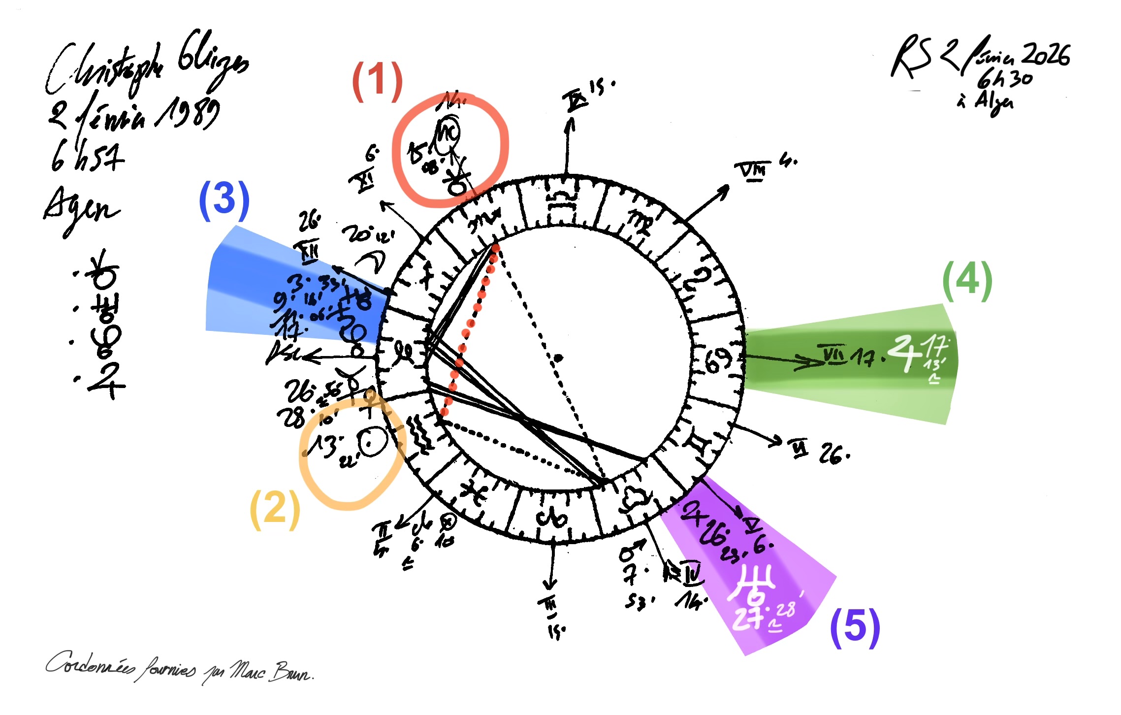 Lorsque le Soleil passera sur Jupiter natal, il accordera sa lumière et sa chaleur au maître de la XII (la prison ) puis passera sur Uranus RS (la libéralisation ). La configuration du ciel, à ce moment précis, réunira tous les éléments nécessaires à la libération de Christophe Gleizes des geôles algériennes. Nous serons alors aux alentours du 17 mai 2026. En conclusion, nous nous permettons de joindre à notre analyse une prière pour cet homme. Puissent les astres lui être favorables et ouvrir la porte de son cachot grâce à une clef invisible… cachée dans le ciel bien avant même sa naissance.